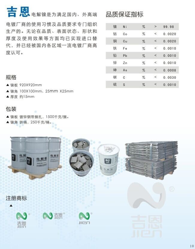產(chǎn)品介紹:吉恩4*4鎳板厚度約18mm,邊緣較薄,可用于五金塑膠電鍍,為市場上高端品牌,純度高,品質(zhì)穩(wěn)定。
